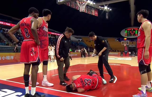 不是在关键三分命中后庆祝,不是在突破上篮后怒吼,而是在末节一次普通的持球突破后,无声地躺在了广州主场的地板上。